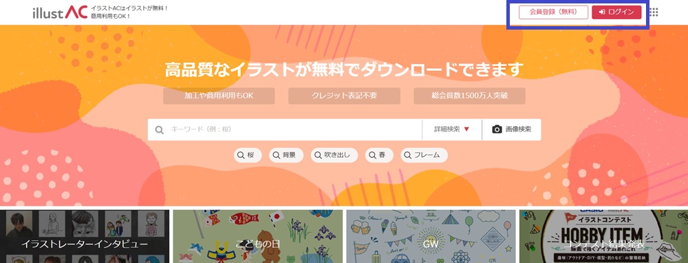 まずはイラストACにログインします。アカウントをお持ちでない方は、トップページ右上のボタンから無料登録できます。