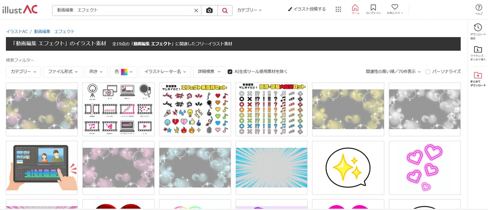 イラストACでは、動画編集に使える素材が豊富に揃っており、無料で手軽に利用可能。さらに、写真ACやデザインACも同一アカウントで使えるため、用途に応じた素材選びがしやすいのも魅力です。