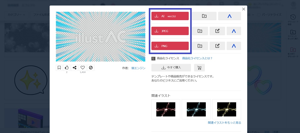 イラスト素材は、ファイル形式別のボタンクリックでダウンロードできるようになっています。