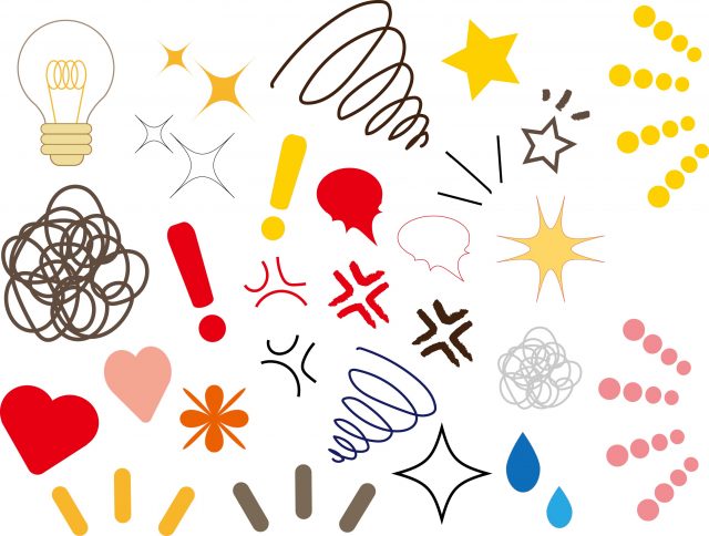 こちらは閃きや驚き、焦り、怒りなど、様々な感情を表す記号のイラストです。配信側の感情を伝えるだけでなく、視聴者の関心や共感にもつながります。